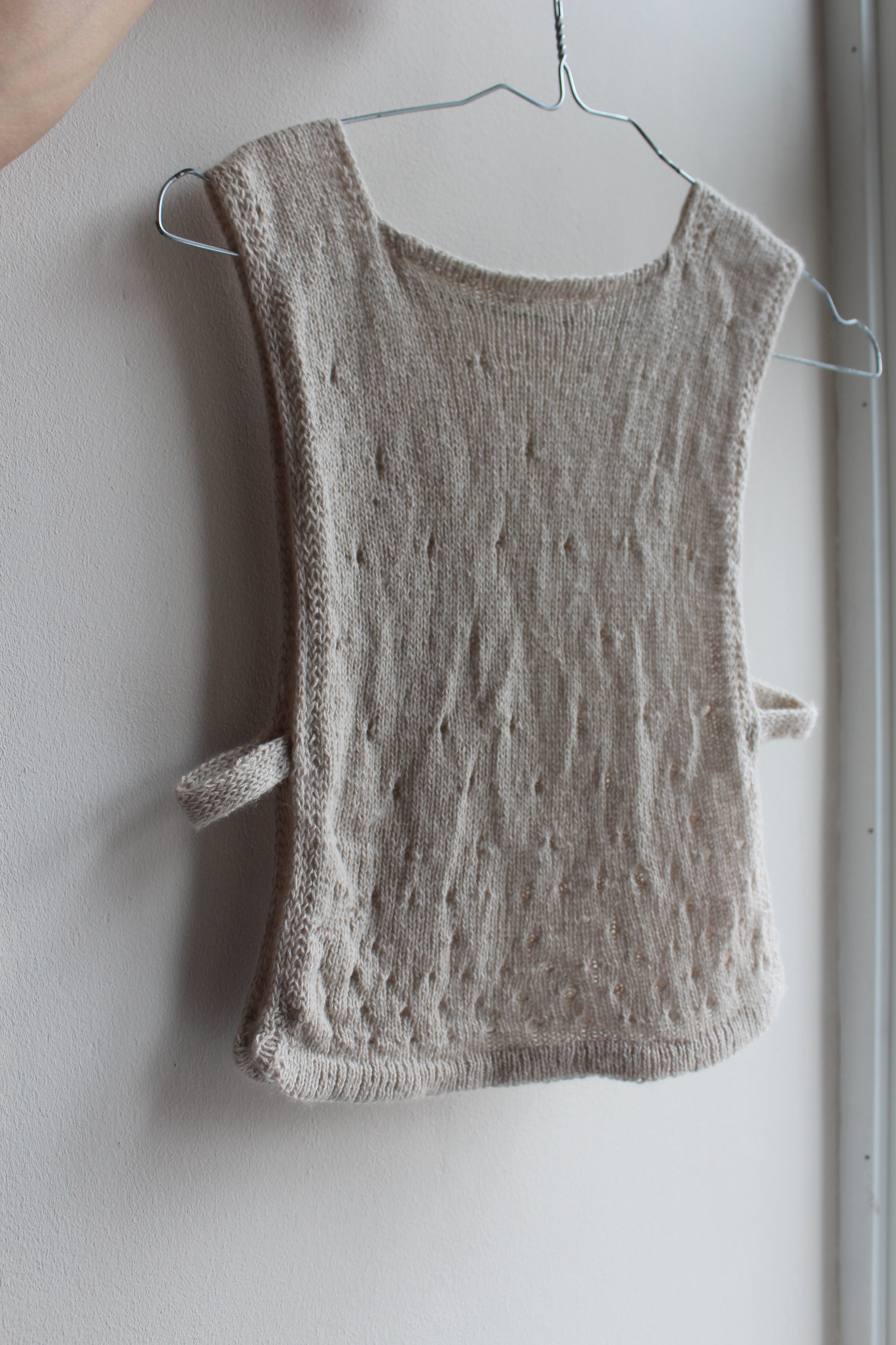 Til slut strikkes sidestropperne, som monteres i hver af vestens åbne sider for at holde vesten let lukket omkring barnets krop.
