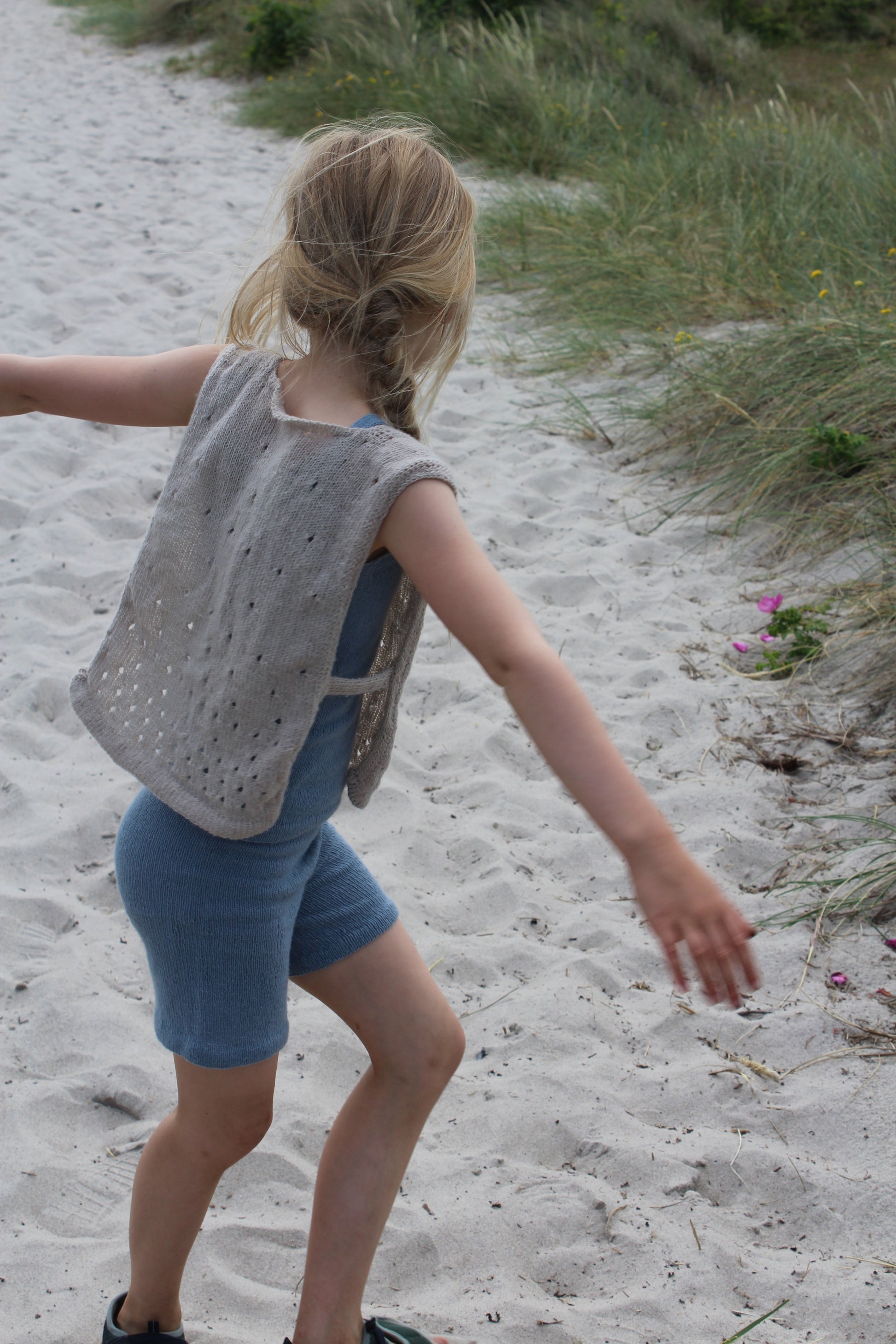 The Wild Berry slipover er en fin børne slipover med et enkelt hulmønster og åbne sider. Slipoveren strikkes nedefra og op ud. Vesten er formet med en afrundet i cord-kant i siderne, mens der over vesten laves et elegant og enkelt hulmønster.