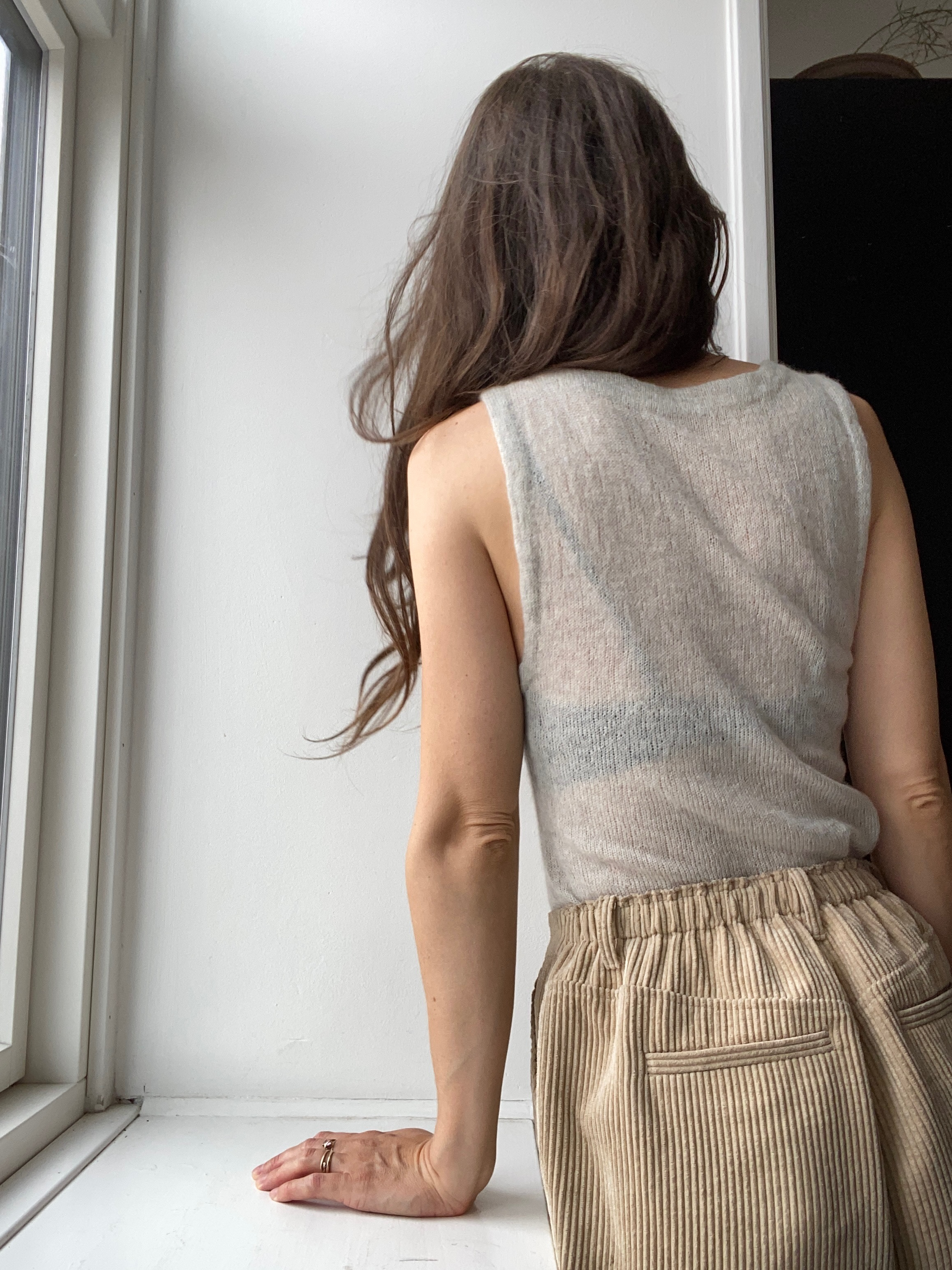 The Casual Top is knitted from the bottom up, starting with finding and casting on your individual number of sts according to your personal measurements to create the front and pack pieces. From here, you’ll knit in the round on a 2,5 mm circular needle until you reach the desired length and the beginning of the arm hole. The top can be knitted as a long or cropped version depending on your preference