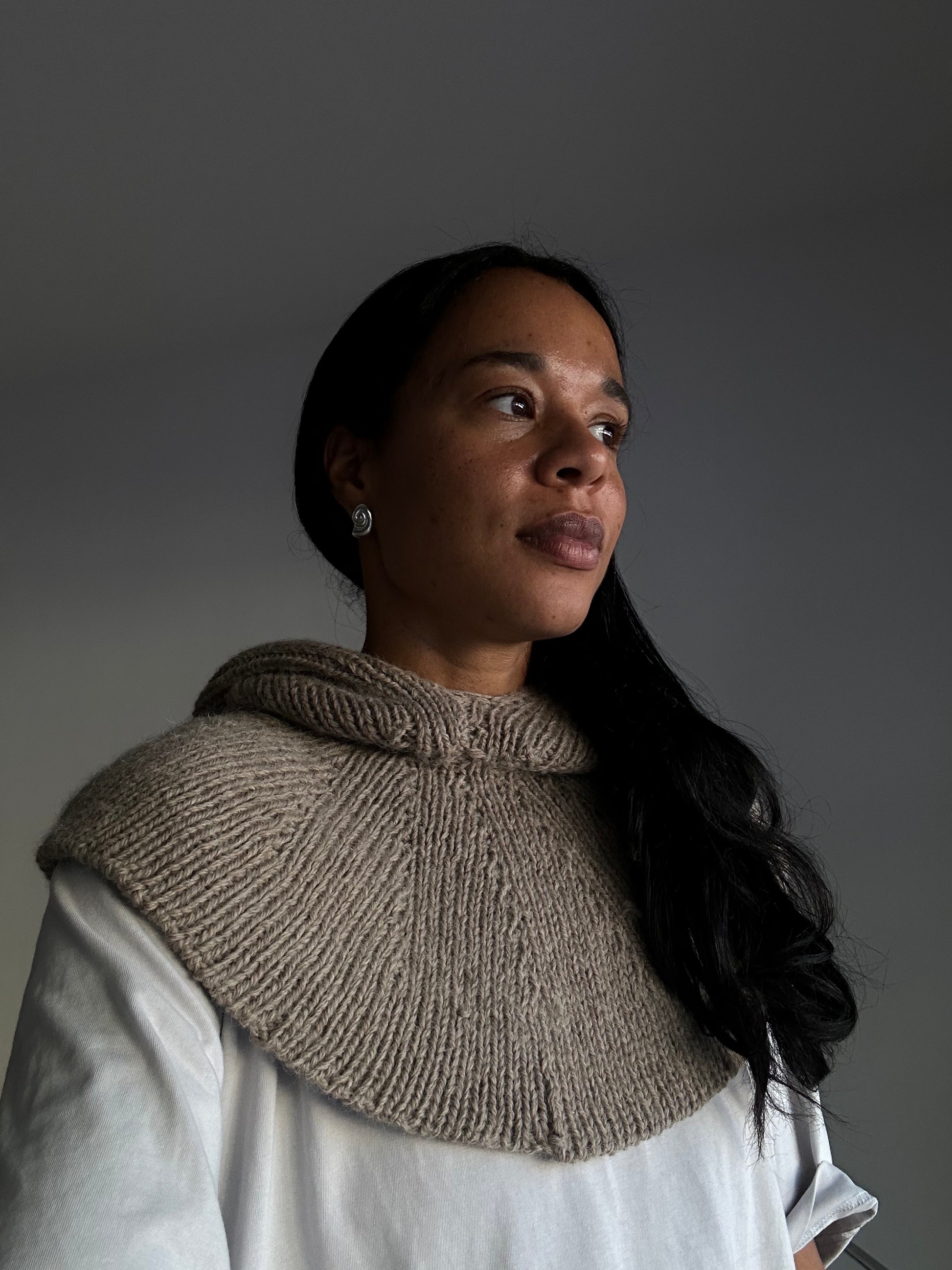 It's has an i-cord edge at the face opening. Once the hood is closed, work decreases in the round at the neck to shape it. Immediately afterward, increases form delicate lines radiating towards the shoulders.