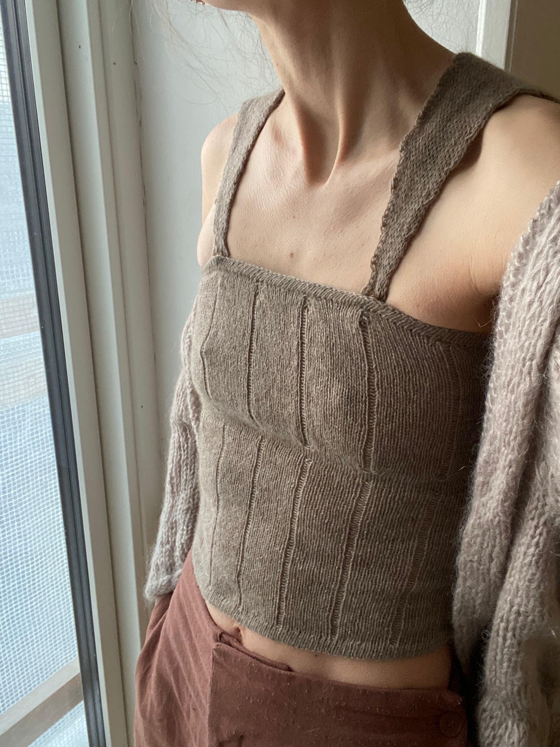 The Tulip Top is a simple top with vertical purl ridges as one of its characteristics. The purl ridges help create both structure and form, as the purl ridges take their shape from the curve of the body, and the bust in particular.